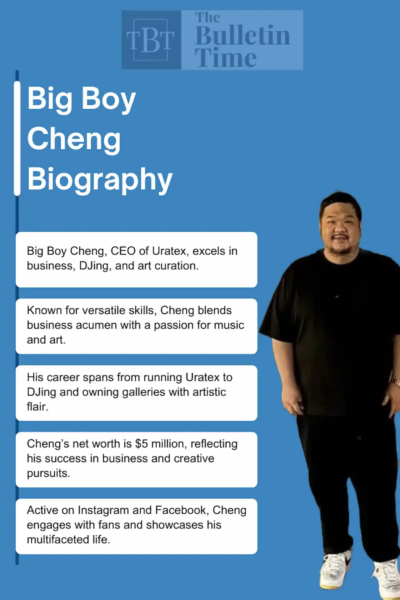 Big Boy Cheng’s social media accounts show his busy and exciting life. His Instagram and Facebook pages showcase his life, work, and interests and connect him with many people who enjoy his art, music, and business advice.