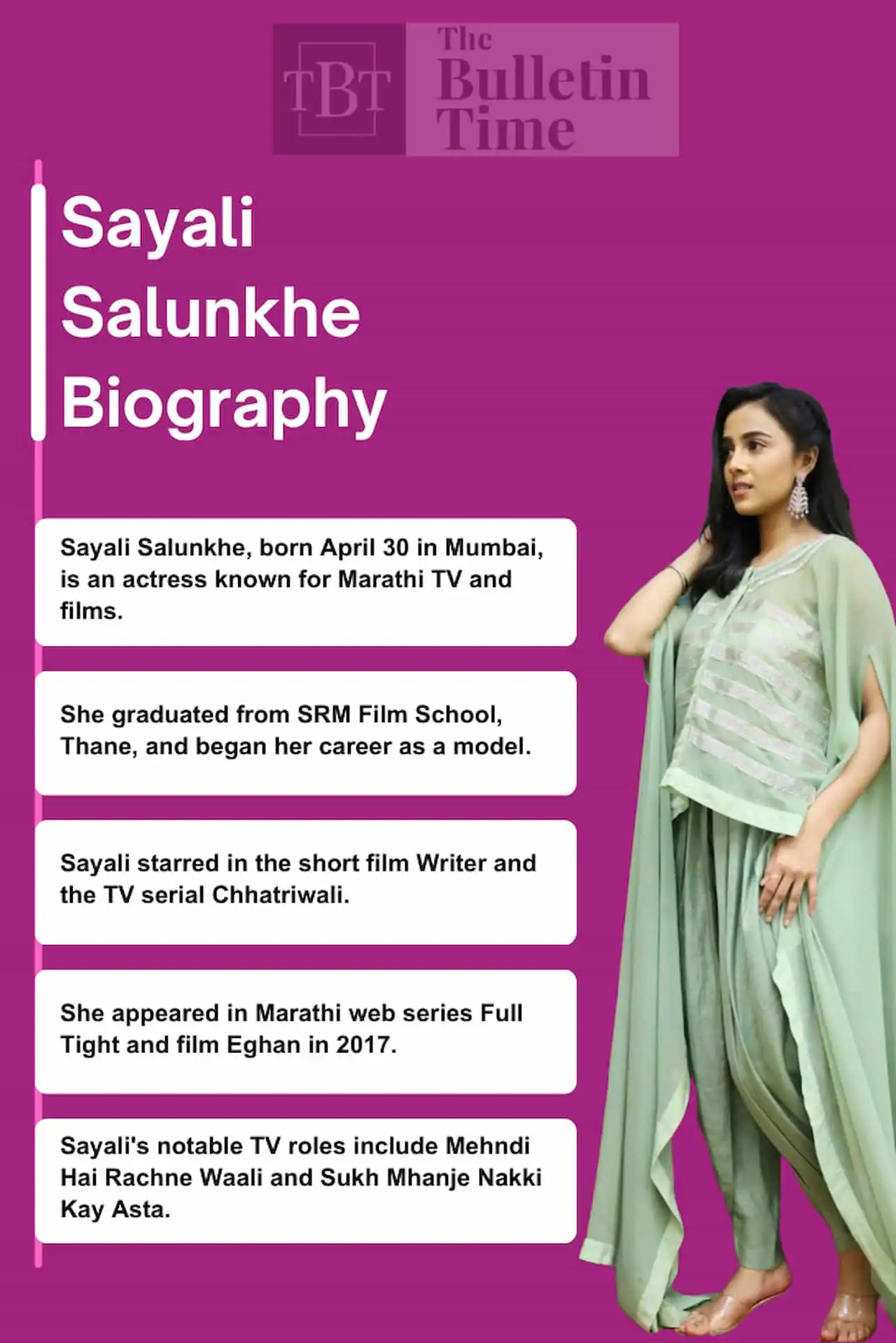 Sayali Salunkhe also appeared in a 2017 Marathi film, Eghan. After graduating, she became a model and entered the entertainment industry.
