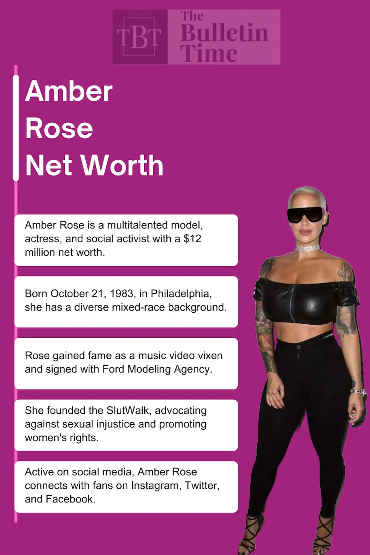 Fans can follow Amber Rose on various social media platforms. She is active on Instagram (@amberrose), Twitter (@DaRealAmberRose), and Facebook (/IamAmberRose). Amber also has a personal website at AmberRoseOfficial.com.