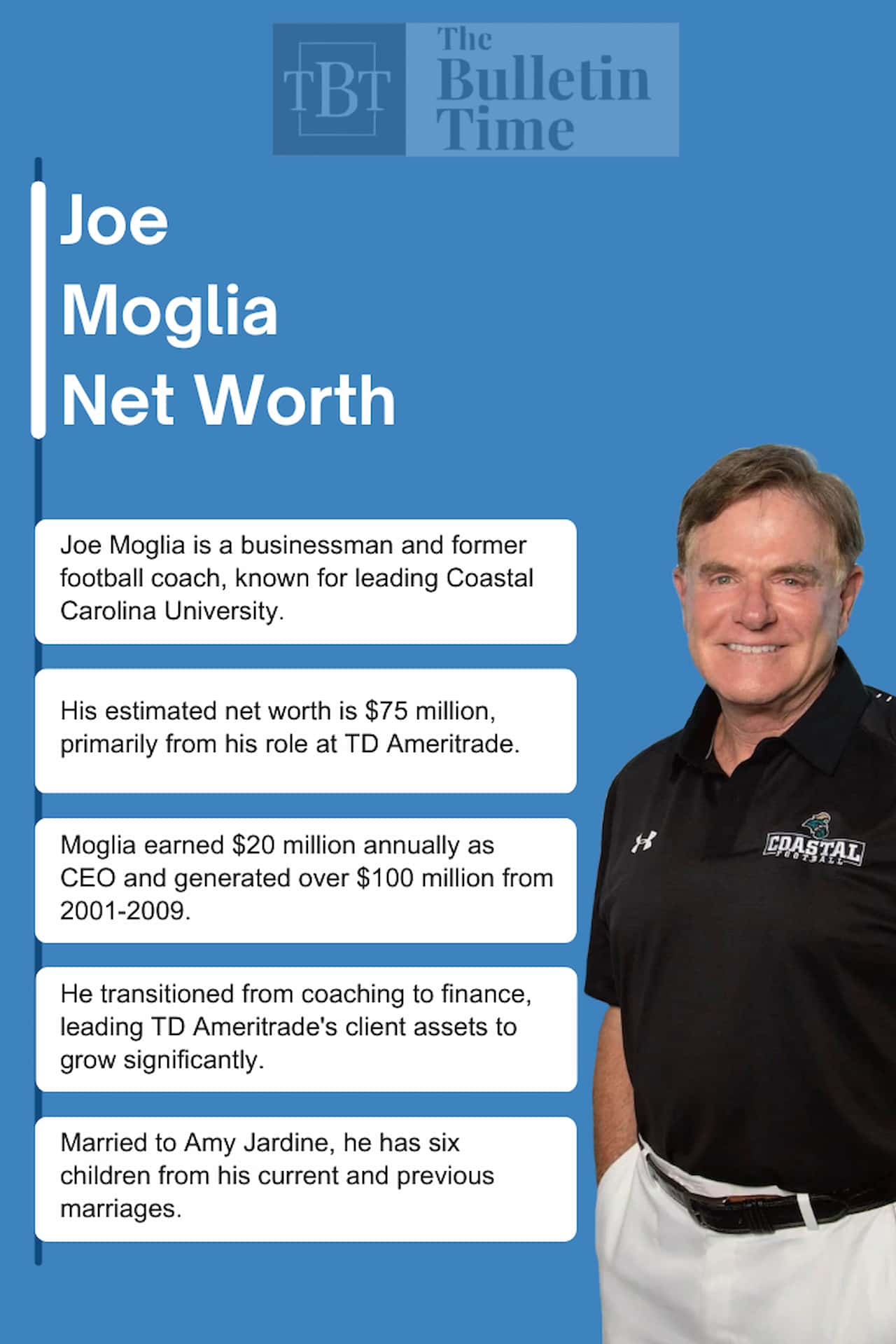 Joe Moglia is famous in entrepreneurship and sports. He is a businessman and a former football coach who served as the head football coach at Coastal Carolina University between 2012 and 2016 and again in 2018.