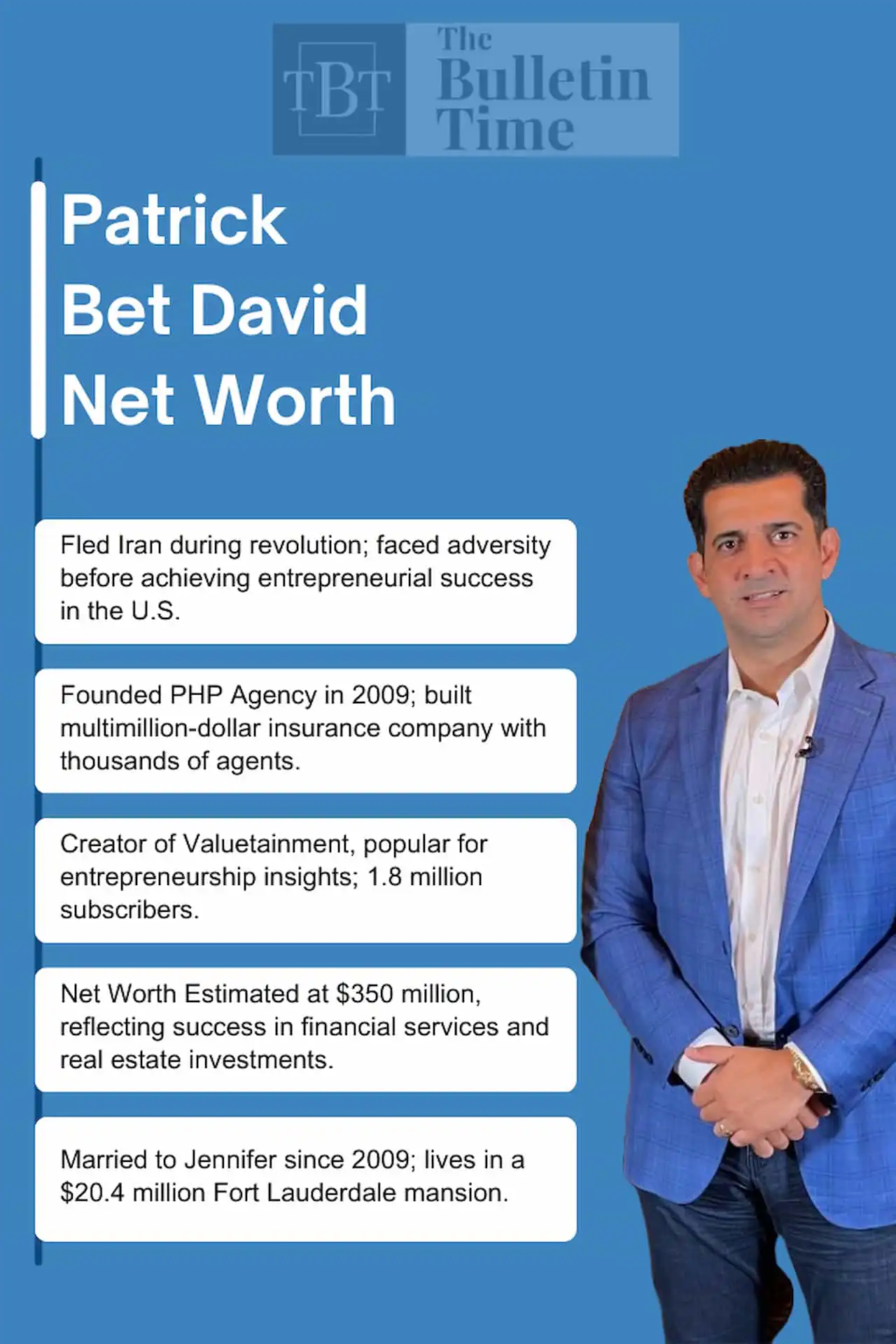 Patrick Bet-David is an Iranian-American entrepreneur, author, and financial advisor with an estimated net worth of $350 million. After immigrating to the United States as a refugee, he served in the U.S. Army for six years before transitioning into the financial services industry. In 2009, Bet-David founded PHP Agency, a rapidly growing insurance marketing organization that has become a multimillion-dollar company with thousands of agents nationwide.
