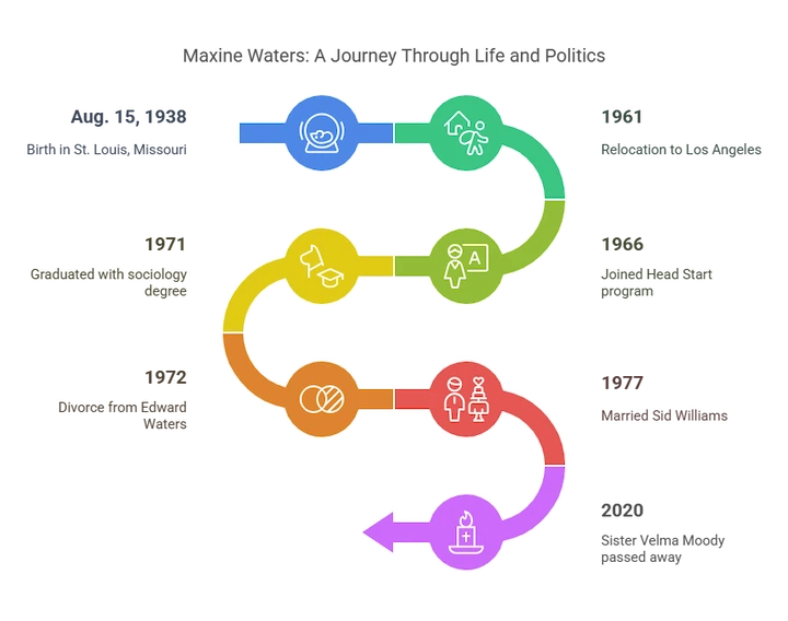 Maxine Moore Waters was born Aug. 15, 1938, in St. Louis, Missouri. The fifth of 13 children, she was born to the former Remus Carr and Velma Lee Moore. Waters was brought up in a working-class family and suffered early hardships, including being abandoned by her father at age 2.