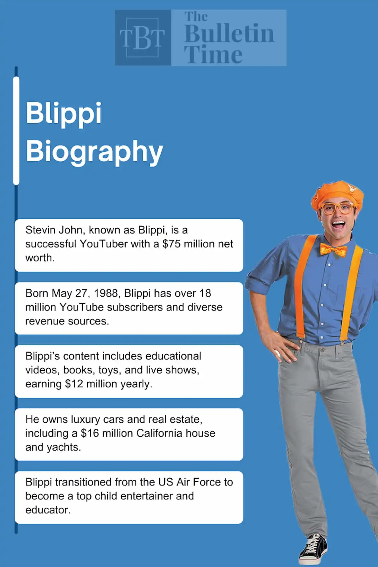 - Blippi earns over USD 13 million from his YouTube ad revenue and endorsements.