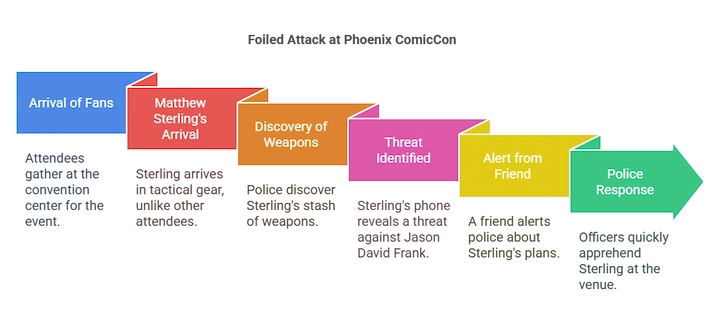 In May 2017, Matthew Sterling entered the Phoenix ComicCon with a plan to murder Power Rangers actor Jason David Frank, shocking fans and prompting changes in convention security policies.