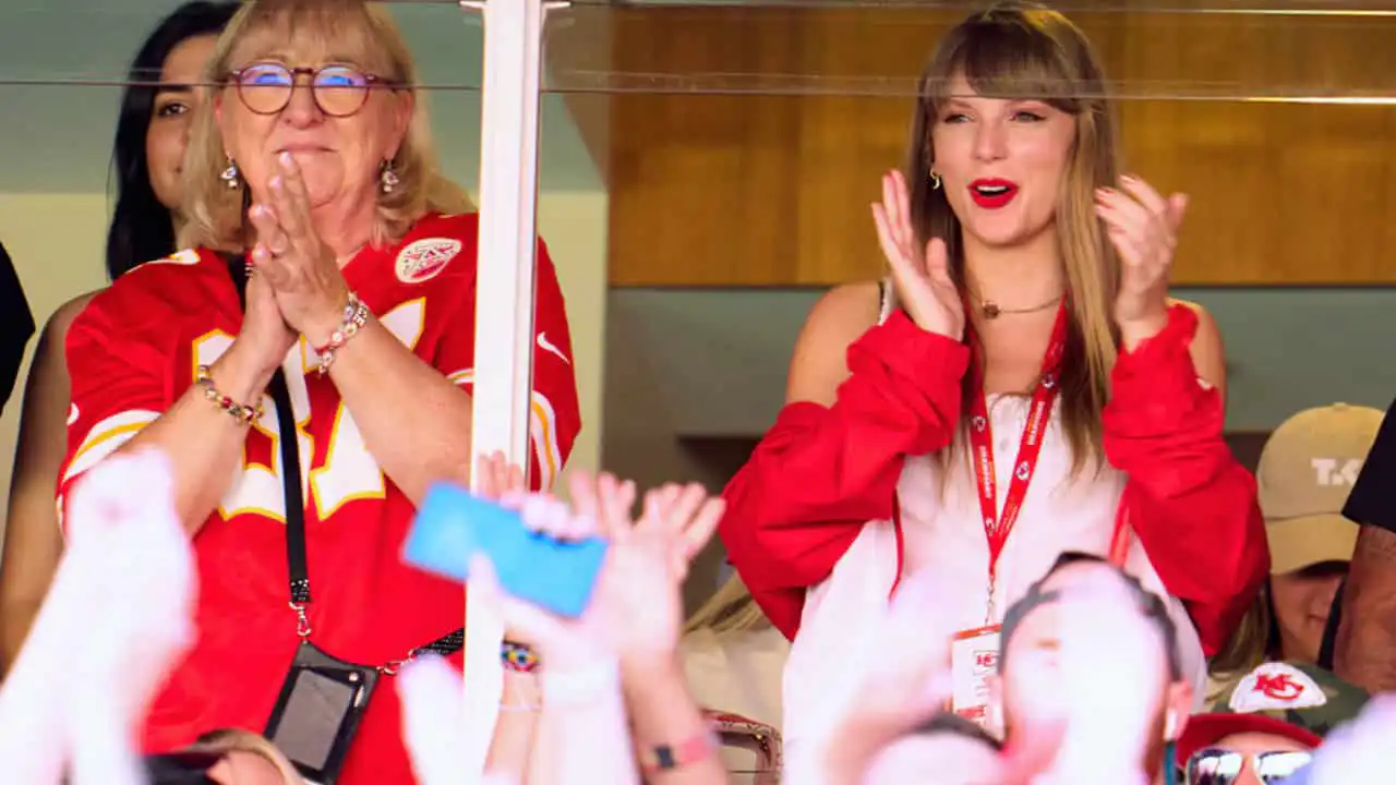 The most heartwarming moment of the night came when a photo captured Andrea Swift and Donna Kelce standing on either side of Taylor, with the mothers grasping hands and smiling at each other in celebration. A fan account on X, formerly Twitter, posted the image with the caption, “Their hands,” and other users quickly reacted to the sweet moment between the two women.”The historical importance of this photo cannot truly be overstated,” wrote on commenter, while another added, “The two most beloved moms in America.”
