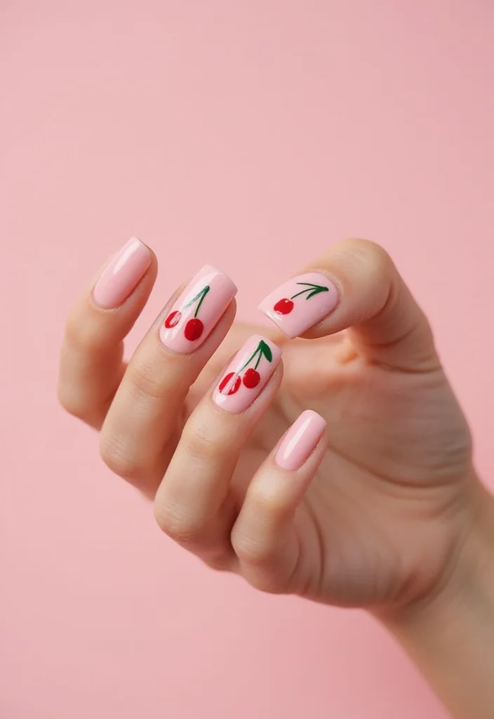 Use a pale pink or nude base to add delicate cherry blossoms alongside vibrant cherries.