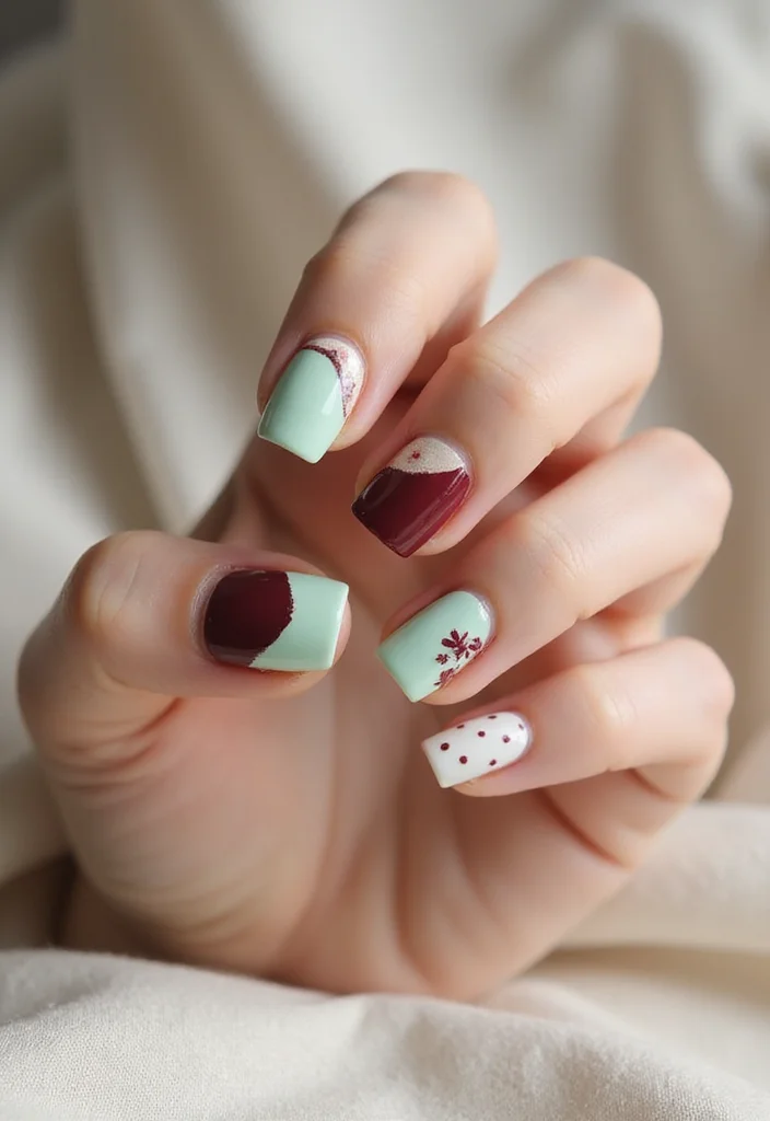 For a fun twist, you can create a half-moon design with cherry red at the tips and mint green at the base, or alternate colors on each nail.