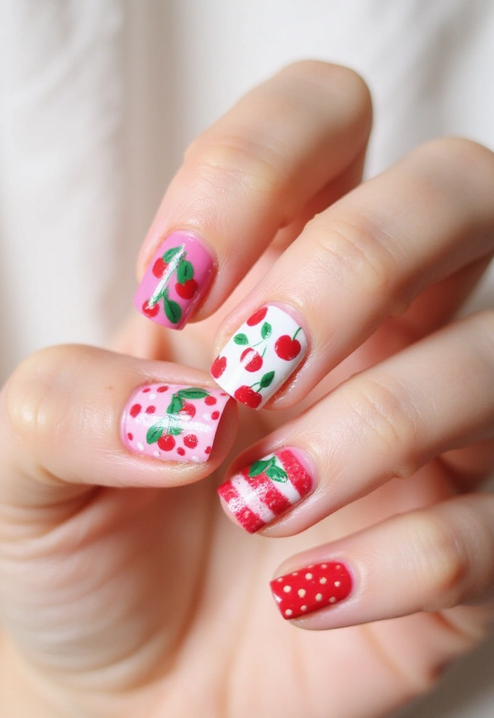 You can feature a rainbow gradient on some nails while adding cute cherry designs on others for a whimsical look that will turn heads.