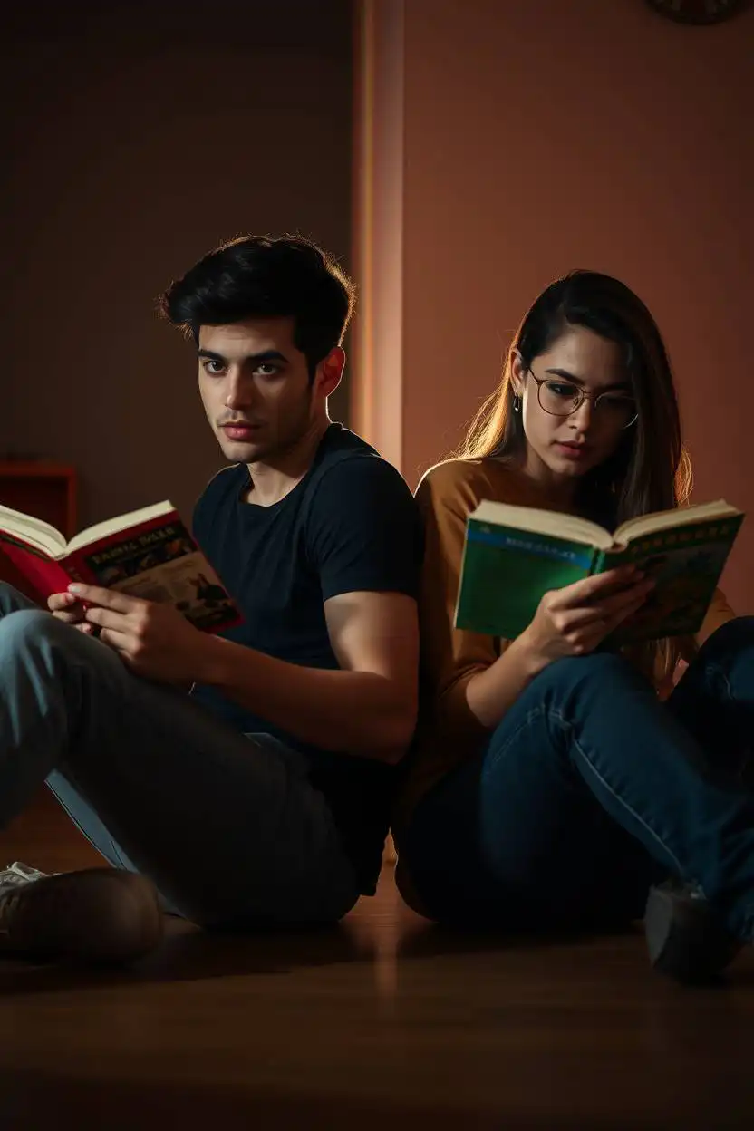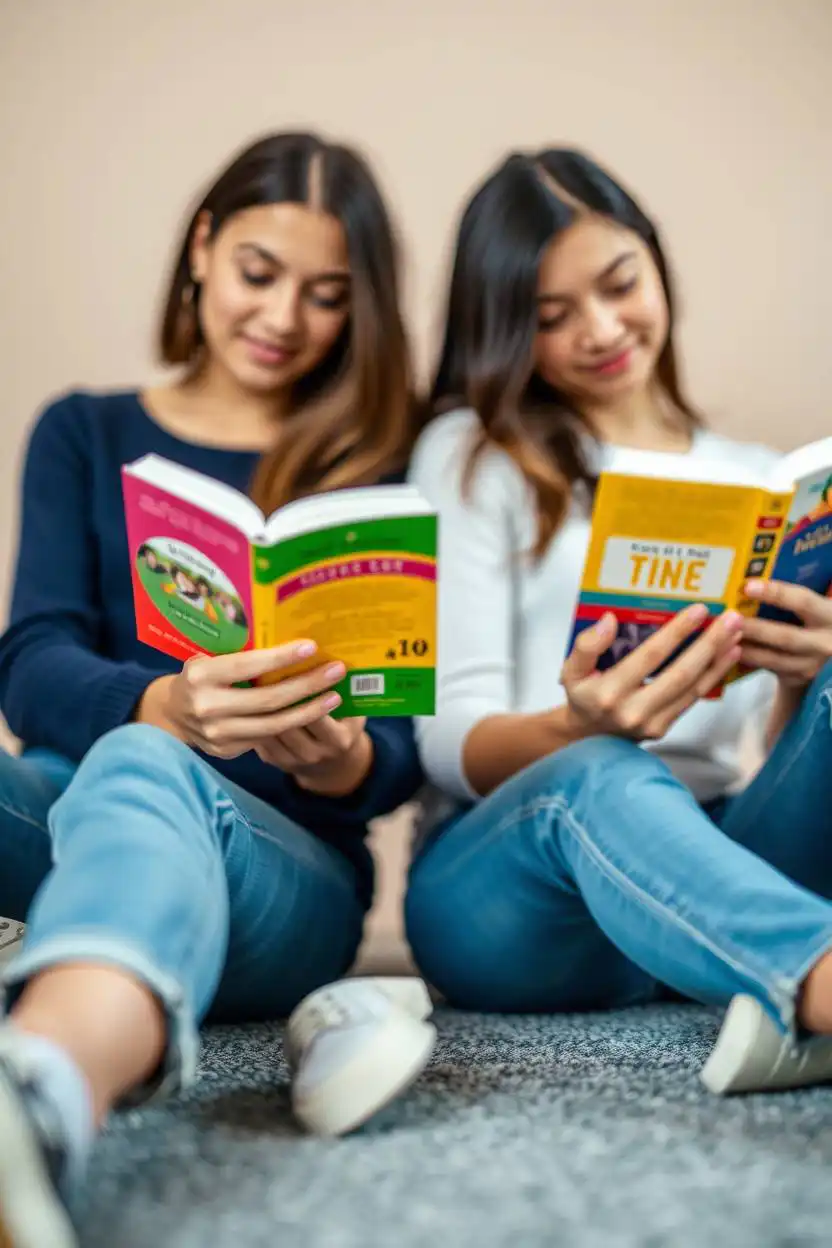 Reading together in a back-to-back position is a calm and cozy pose. You and your friend sit close, each holding a book, but your backs touch. It shows you are comfortable and enjoy quiet time together. You can read your books or the same one.