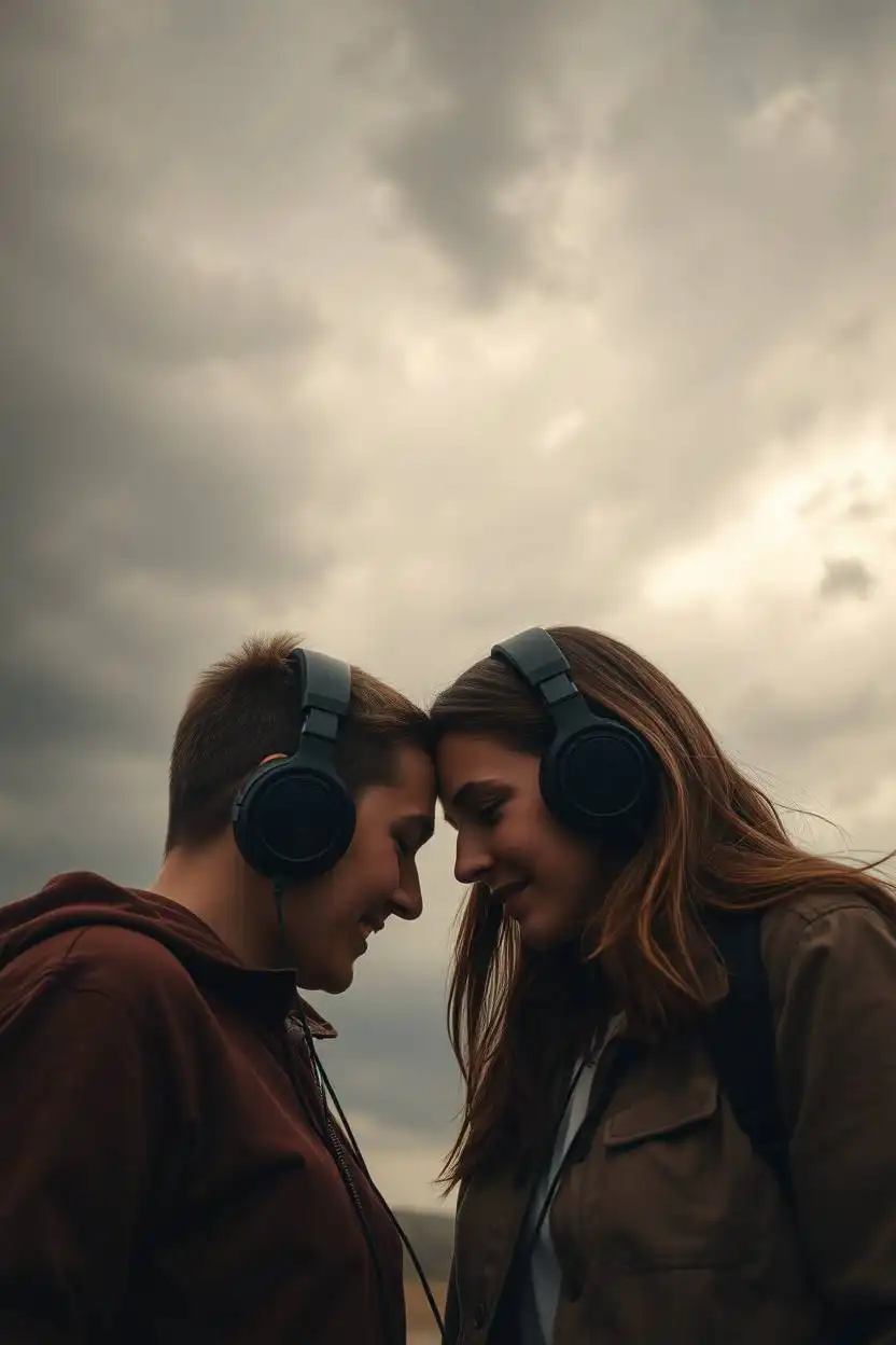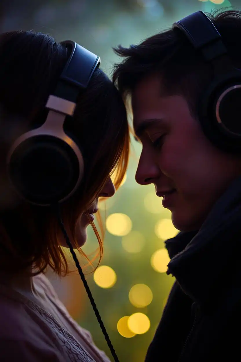 Sharing headphones is a sweet and fun pose. You and your friend or partner listen to music or a podcast together using one pair of headphones. You might lean close or smile as you enjoy the same sounds. This pose suggests that you enjoy sharing things and have similar tastes.