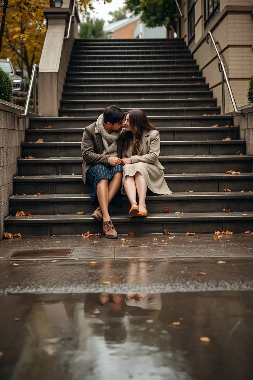 It’s excellent for showing friendship or closeness without being too formal. You can use indoor stairs or outdoor steps. Sitting on a staircase together makes photos look relaxed and real. It’s a great way to capture everyday moments with someone special.