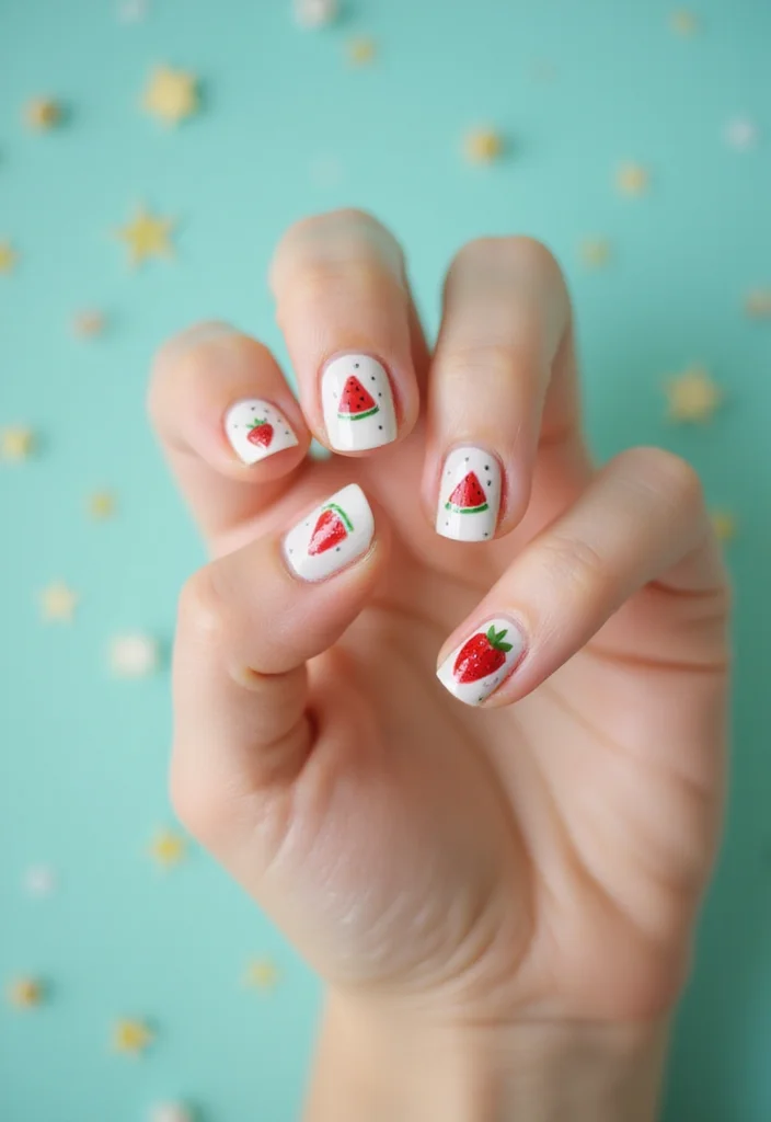 - Kids can paint cute fruit designs on their short nails, such as watermelons, oranges, or strawberries. Start with a bright base color and use a fine brush to detail the fruit. This design is perfect for summer and brings a playful touch to their style!