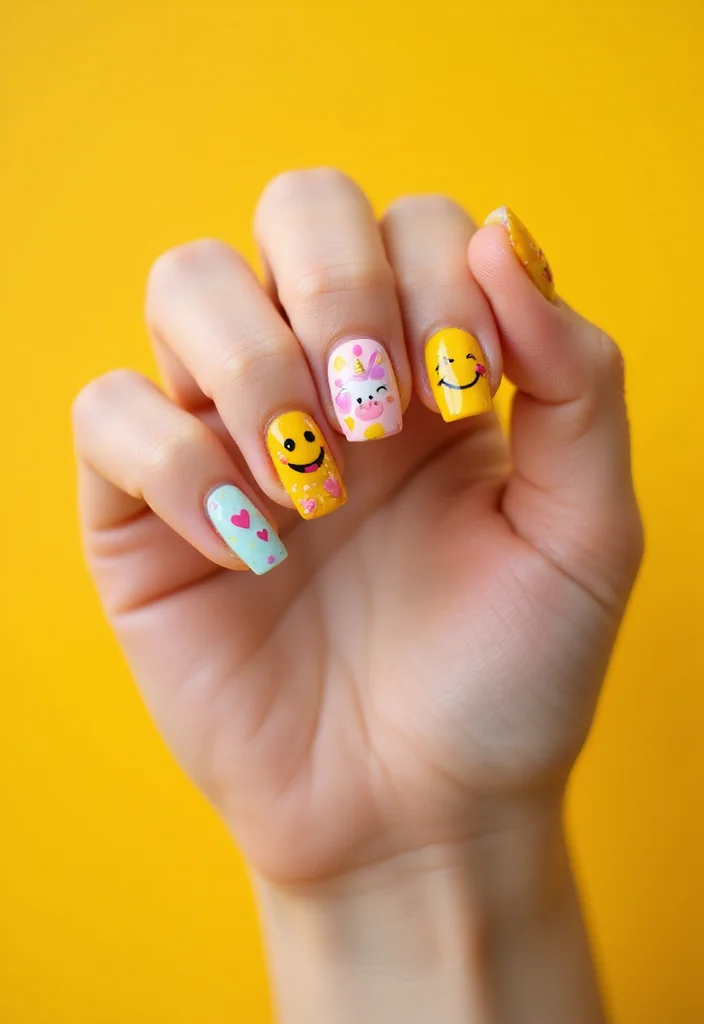 - Pick popular emojis like smiley faces, hearts, or even unicorns to create fun designs. Start with a bright base coat and use a fine brush to paint the emojis on each nail. Kids can have a blast picking out which emojis to use, allowing for personalization and expression.