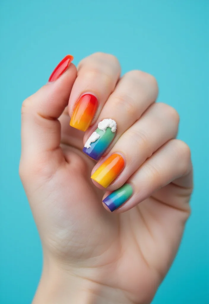 - For a cheerful look, paint each nail a different rainbow color, starting from red and progressing to violet. You can create a gradient effect by blending two colors on each nail for an added twist.