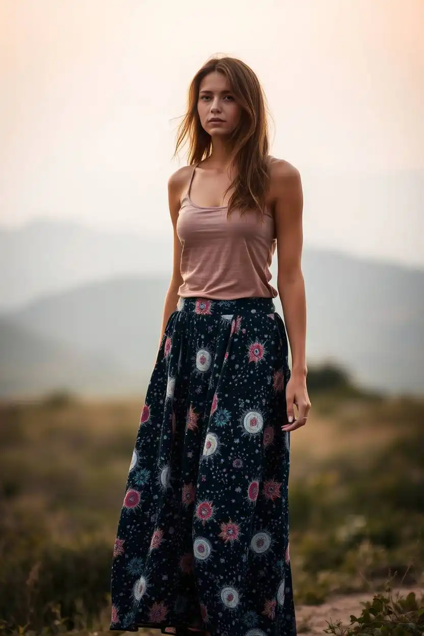 A celestial print maxi skirt is long and covered in stars, moons, and planets. It feels magical, like wearing the night sky. Pair it with a simple tank top in a matching color. This outfit is both cool and comfortable, making it great for summer days or stargazing at night.