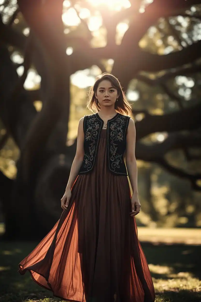A vintage embroidered vest is a short jacket featuring intricate stitching, often in the form of flowers or swirls. It looks old-fashioned and special. Wear it over a maxi skirt, which is long and flows when you walk.