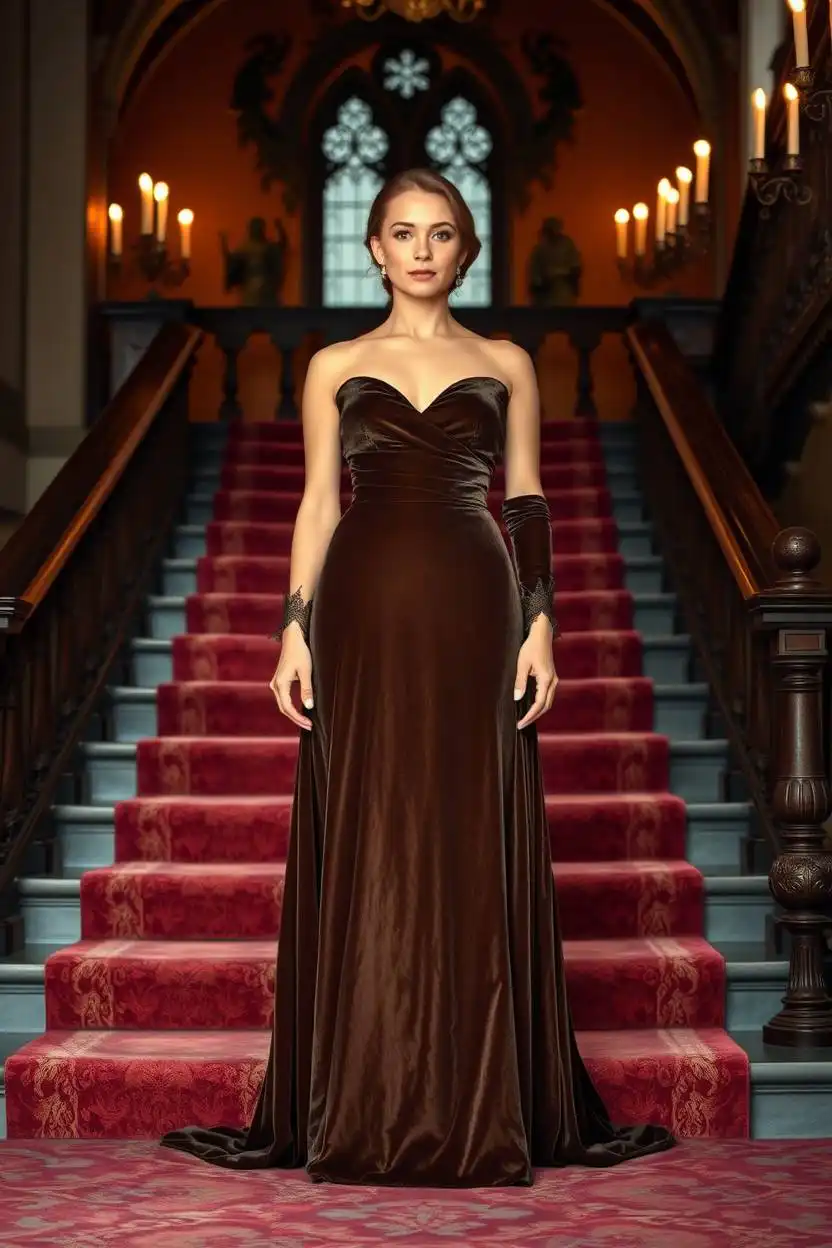 A vintage-inspired velvet gown feels soft and looks fancy, like something from a royal ball. The velvet shines in the light and comes in deep colors, such as green, blue, or red. This gown might have pretty buttons or lace details.