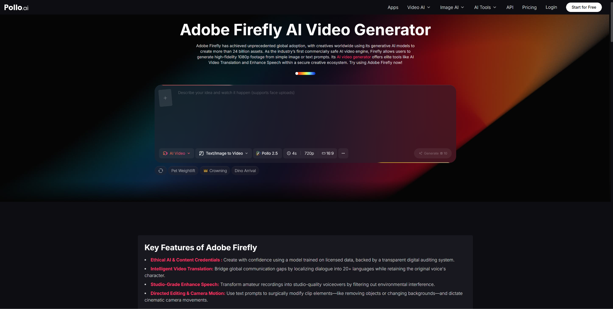 For designers who also create animated and video content for clients, Pollo AI offers access to tools like Adobe Firefly’s AI that complement the image generation workflow with design-focused AI capabilities integrated into the Creative Cloud ecosystem.