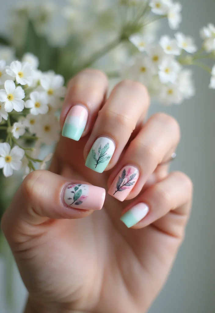 This design features a gradient effect that transitions smoothly between soft colors like baby pink, mint green, and lavender. The ombré look can be achieved using a makeup sponge for a flawless blend. For a little extra flair, add tiny white dots or delicate flower stickers at the cuticles for a whimsical touch.