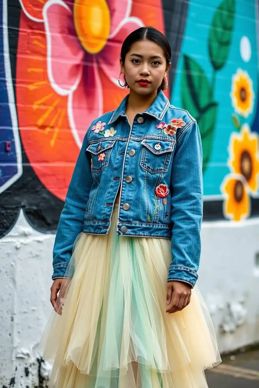 An embroidered denim jacket is cool and creative. The embroidery might be flowers, stars, or your favorite things. When you wear it over a tulle midi skirt, you mix tough and soft styles. The skirt is light and fluffy, while the jacket is sturdy.