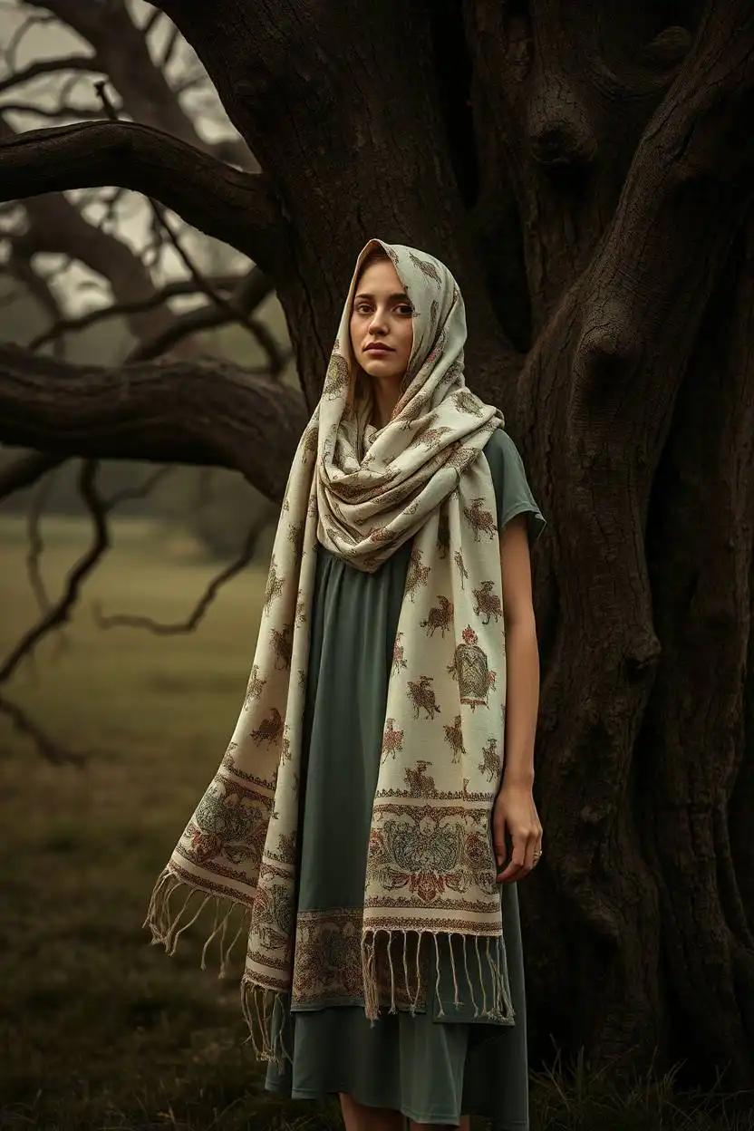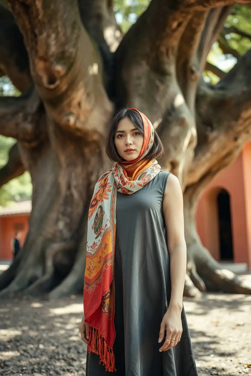 A fairy tale motif scarf features images from stories, such as castles, dragons, or magical creatures. Wrap it around your neck or tie it in your hair. Wear it with a simple shift dress, which is easy to move in and looks neat.