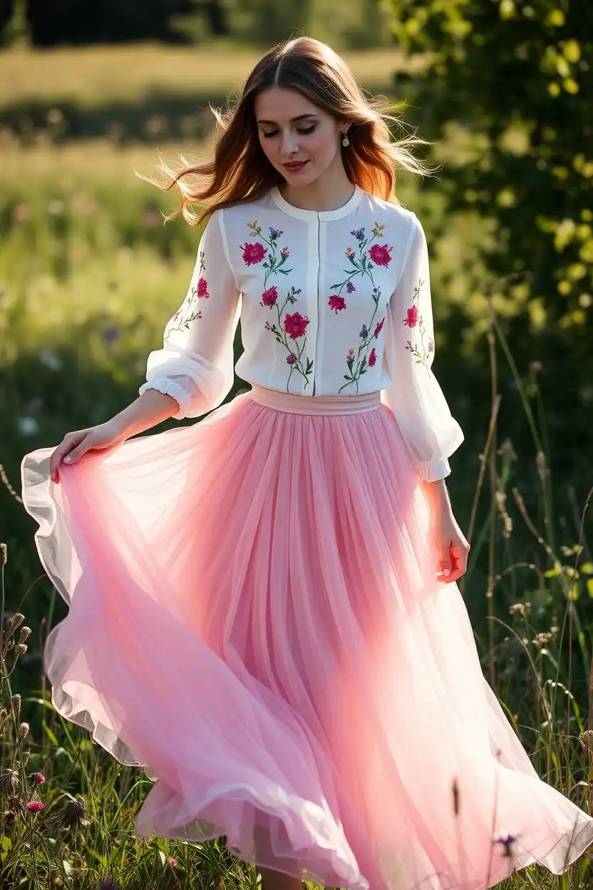 This outfit is perfect for parties, school events, or just when you want to feel special. The colors can be soft, like pink or lavender, or even bright and bold. Together, the tulle skirt and the pretty blouse make you look like you jumped out of a fairy tale.